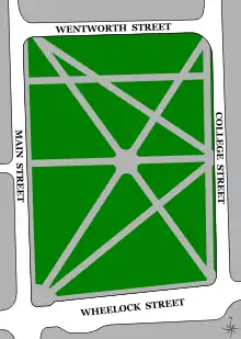 Benches and trees border the outside edges of the Green; two flagpoles stand at the center of the western side.[2] The plot is bounded by four streets: Wheelock Street to the south, College Street to the east, Wentworth Street to the north, and Main Street to the west. All but Wheelock Street are one-way roads, with traffic circulating counter-clockwise around the Green.[6]