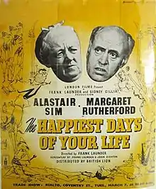 The Happiest Days of Your Life is a 1950 British comedy film directed by Frank Launder, based on the 1947 play of the same name by John Dighton.[2] The two men also wrote the screenplay. It is one of a stable of classic British film comedies produced by Frank Launder and Sidney Gilliat for British Lion Film Corporation. The film was made on location in Liss and at Riverside Studios, London. In several respects, including some common casting, it was a precursor of the St. Trinian's films of the 1950s and 1960s.[3]