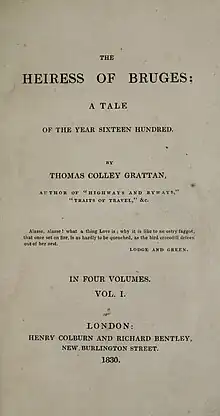 The Heiress of Bruges is an 1830 historical novel by the Irish writer Thomas Colley Grattan.[1] It was released in four volumes by London publishers Henry Colburn and Richard Bentley. Grattan wrote the novel while living in Brussels, shortly before the Belgian Revolution led to its independence from Dutch rule. He dedicated to Lady Bagot, the wife of British Ambassador Sir Charles Bagot. The work is set in Bruges around 1600. He was inspired partly by the success of the Waverley novels, and one reviewer described novel as the work of a "Flemish Walter Scott".[2] It was given a largely positive critical reception, sold fairly and well and was subsequently translated into several languages.[3] Grattan followed it with another historical novel set in the Low Countries Jacqueline of Holland (1831).