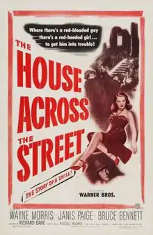 The House Across the Street is a 1949 American comedy/newspaper film directed by Richard L. Bare and written by Russell S. Hughes.[2] The film stars Wayne Morris, Janis Paige, Bruce Bennett, Alan Hale, Sr., James Mitchell and Barbara Bates. The film was released by Warner Bros. on September 10, 1949.[3][4] The story on which the screenplay was based, written by Roy Chanslor, was originally made as the movie Hi Nellie in 1936.[5] The source material had also been reworked in Love Is on the Air (1937) and You Can't Escape Forever (1942).