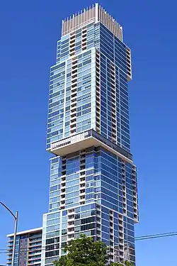 It contains 58 floors, 370 condos, and it has been nicknamed the "Jenga Tower", and the "Tetris Tower".[1] The 9th floor contains amenities such as a heated pool, club room, playground, and dog park, while the 34th floor contains a fitness center, yoga deck, and an outdoor lounge.[2]