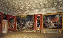 When the painting arrived in Russia in August 1834, it was received with as much enthusiasm as it had been in Italy, according to Gogol as much by those with a refined taste as those who were ignorant of art.[13] Bryullov was made an honorary free associate of the academy and awarded the Order of St Anne, third class. He was made a professor at the academy in Saint Petersburg and placed in charge of history painting. He met the Tsar. Ivan Turgenev described the painting as "the glory of Russia and Italy" and it inspired Alexander Pushkin to write a poem about the destruction of Pompeii.[4] Russians saw the painting as elevating the status of Russian art in Europe generally and in turn it elevated the status of painters in Russia. Gogol opined that it was a "bright resurrection of painting, which has been for too long in some sort of semi-lethargic state",[4] but was not alone in seeing a parallel between Pompeii and contemporary Saint Petersburg and the painting as a forecast of divine retribution for the modern city's decadent Western ways.[14] The dissident Alexander Herzen, meanwhile, saw it as an allegory about the collapse of European monarchies[6] or the tyrannical power of the Russian state over the individual.[15]