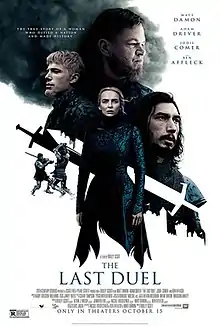 The Last Duel is a 2021 epic historical action drama film[6] directed by Ridley Scott from a screenplay by Nicole Holofcener, Ben Affleck, and Matt Damon, based on the 2004 book The Last Duel: A True Story of Crime, Scandal, and Trial by Combat in Medieval France by Eric Jager. Set in medieval France, the film stars Damon as Jean de Carrouges, a knight who challenges his former friend, squire Jacques Le Gris (Adam Driver) to a judicial duel after Jean's wife, Marguerite (Jodie Comer), accuses Jacques of raping her. The events leading up to the duel are divided into three distinct chapters, reflecting the contradictory perspectives of the three main characters. Affleck also stars in a supporting role as Count Pierre d'Alençon.