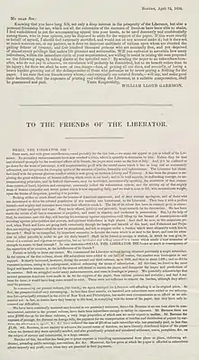Garrison co-published weekly issues of The Liberator from Boston continuously for 35 years, from January 1, 1831, to the final issue of December 29, 1865.[1] Although its circulation was only about 3,000, and three-quarters of subscribers (in 1834) were African Americans,[2] the newspaper earned nationwide notoriety for its uncompromising advocacy of "immediate and complete emancipation of all slaves" in the United States. Garrison set the tone for the paper in his famous open letter "To the Public" in the first issue: