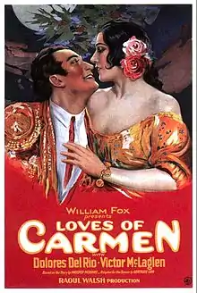 The Loves of Carmen is a 1927 American silent romantic drama film directed by Raoul Walsh. The film, based on the novella Carmen by Prosper Mérimée, stars Dolores del Río in the title role, and Don Alvarado as Jose.[1] Due to the public apathy towards silent films, a sound version was also prepared in 1928. While the sound version has no audible dialog, it was released with a synchronized musical score with sound effects using both the sound-on-disc and sound-on-film process.