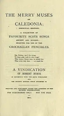 In 1911 an edition was printed by the Burns Federation. The title page reads: The Merry Muses of Caledonia; A Collection of Favourite Scots Songs Ancient and Modern; Selected for Use of the Crochallan Fencibles. It also includes an essay, entitled A Vindication of Robert Burns in connection with the above publication and the spurious editions which succeeded it..[1] This edition had a moral tone, and intended to challenge the collection's notoriety, and its identification as pornography. It also attempted to identify the authorship of some of the poems.[2]