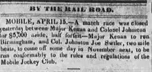 As early as 1836 Major Kenan's "Birmingham" raced Col. Johnston's "Joe Swiler" for $5,000.[1]