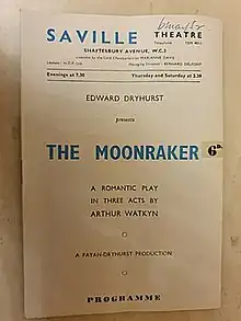 The Moonraker is a historical play by the British writer Arthur Watkyn. It premiered at the Cambridge Arts Theatre and in June 1952 had a brief run at the Saville Theatre in London's West End. The cast included Jean Kent, Griffith Jones, Henry Oscar, Paul Whitsun-Jones, William Moore and Julian Somers. It was directed by Terence De Marney.[1]