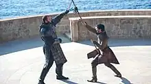 ![]() Gregor "The Mountain" Clegane (left) and Oberyn "the Viper" Martell (right) engage in a trial by combat. This scene was acclaimed by critics. | |