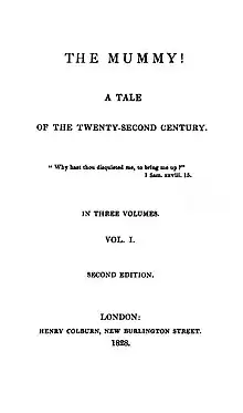 The Mummy! A Tale of the Twenty-Second Century is an 1827 three-volume novel written by Jane Webb (later Jane C. Loudon). It concerns the Egyptian mummy of Cheops, who is brought back to life in the year 2126. The novel describes a future filled with advanced technology,[1] and was the first English-language story to feature a reanimated mummy.[2]
