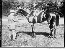 The Panther was a brown horse officially bred by the British National Stud. He was sired by August Belmont Jr.'s American-bred St Leger winner Tracery out of Countess Zia, a mare owned by Lord Wavertree. In 1915, Wavertree donated all his bloodstock, including the pregnant Countess Zia, to the British Government, and The Panther was foaled the following spring at the National Stud.[2] In 1916, the yearling colt was sent to the sales at Newmarket, Suffolk where his striking appearance made him the subject of considerable interest before he was bought by the shipping magnate Sir Alec Black for 3,600 guineas, the highest price paid for a yearling that year.[3] Black sent the colt to his private trainer George Manser at his Warren House stables at Newmarket.