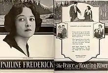 The Peace of Roaring River is a lost[1][2] 1919 American silent Western film produced and distributed by Goldwyn Pictures and starring Pauline Frederick. Hobart Henley and Victor Schertzinger directed the production.[3]