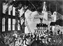 This illustration depicts the tenement fire spectacle from the melodrama, The Poor of New York, by Dion Boucicault, 1857. Act V, Sc. 2