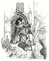 The youth, on the horse, reaches the princess's tower atop the mountain. Woodcut by Ludwig Richter to Bechstein's fairy tale Hirsedieb (1853).