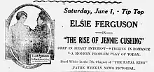 The Rise of Jennie Cushing is a 1917 American silent drama film directed by Maurice Tourneur, produced by Famous Players–Lasky, and distributed by Artcraft Pictures, an affiliate of Paramount Pictures. The story based upon the novel The Rise of Jennie Cushing by Mary Watts and stars Broadway's Elsie Ferguson. The film marked Ferguson's second motion picture. It is a lost film.[1][2][3]