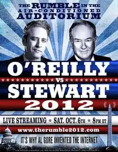 The Rumble in the Air-Conditioned Auditorium: O'Reilly vs. Stewart 2012 was a debate between Bill O'Reilly of The O'Reilly Factor and Jon Stewart of The Daily Show and moderated by CNN news anchor E. D. Hill. It took place on October 6, 2012, in Washington, D.C., starting at 8 pm with most of its audience viewing via Internet stream and subsequent download. According to The New York Times, O'Reilly and Stewart "have been guests on each other’s programs since 2001" but "rarely agree on anything except their mutual respect for each other".[1]