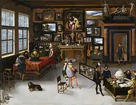 The painting falls in the genre of the gallery paintings. Gallery paintings depict large rooms in which many paintings and other precious items are displayed in elegant surroundings. The earliest works in this genre depicted art objects together with other items such as scientific instruments or peculiar natural specimens. Frans Francken the Younger and Jan Brueghel the Elder started the genre by creating paintings of art and curiosity collections in the 1620s.[4] Some gallery paintings include portraits of the owners or collectors of the art objects or artists at work.[5] The genre became immediately quite popular and was followed by other artists such as Jan Brueghel the Younger, Cornelis de Baellieur, Hans Jordaens, David Teniers the Younger, Gillis van Tilborch and Hieronymus Janssens.