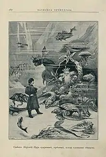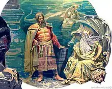 The Morskoi Tsar ("Sea Tsar"; "Sea King";[23] "The Marine or Water King")[24] of Slavic folklore appears as the antagonist of the tale: a king with magical powers that forces the protagonist to perform difficult tasks, which the prince does with the help of the Sea Tsar's youngest daughter.[25][26] The Sea Tsar or Sea King also appears in Slovak and Slovene folklore with the name Morskog Kralja or Morski kralj,[27][28] and is reported to exist in Belarusian mythology as Car-Mora.[29] He is also described as "a mighty and wealthy" regent who rules "in the depths of the sea",[30] but he may also live "in the depths of the lake, or the pool".[31]