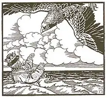 In a tale from the Mari people with the title "Как мышка и воробей поссорились" ("How the Mouse and the Sparrow Fought")[lower-alpha 3], a mouse and a sparrow argue over the food. The mouse complains to the king of land animals, the lion, and the sparrow to the king of the birds, the eagle. In a fight, the lion hurts the eagle and the bird hides one a branch for some time. The eagle is found by a hunter, is brought home, convalesces and takes the man on a journey to its sisters. The hunter receives a present from the eagle and opens it.[47] A large palace springs out of the box, and a grey-bearded man with shaggy appearance offers to close the box in return for what the man does not know he has at home (the man's newly-born son). The man discovers he mistake he made when he goes home and bets himself up for it. Years later, the grey-bearded man appears to the boy in a dream and beckons him to come. The boy leaves home and finds an old woman in the forest. The old woman reveals the grey-bearded man is her elder brother and that he plans to kill the boy. The old woman directs her to her sister, another elder. The second old woman advises the boy to wait by the lake for the coming of her brother's twelve daughters, who will appears in the shape of ducks and bathe in the water; he is to steal the duck skin of the youngest. The boy follows the instructions and talks to the sorcerer's youngest daughter. She regains the duck skin and warns the boy that her father will first set a test for him: to choose one of twelve doves, and she asks him to choose her as wife. The boy obeys the duck maiden's advice and gets her as wife. Later, her father orders the boy to raze a forest to the ground and plant a wheat field overnight. The duck maiden helps him and later they escape form her father by shapeshifting into other objects.[48]