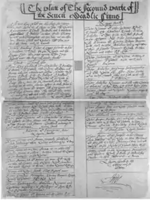 The play is significant, however, because the "plot" of Part 2 still exists; it was discovered in the cover of a 17th-century manuscript play, The Tell Tale, in a collection at Dulwich College. Originally assumed to be part of Edward Alleyn's papers, subsequent investigation suggests it was part of the collection bequeathed by player-bookseller William Cartwright the younger (c.1606–86), and was obtained by Edmond Malone when he traded the college some old religious tracts for plays from the Cartwright bequest.[2] As the term was used in English Renaissance theatre, the "plot" of a play was a chart that summarized its action; it was posted in the "tiring house" or backstage area of a theatre. The plot of S.D.S. 2 has a square hole punched in its middle, where it was hung on a board for all to read. The cast members of an Elizabethan dramatic production had their own parts written out for them, with relevant entrances and cues but they did not have their own individual copies of the play text as a whole. So the posted plot was an important resource in keeping the production organized. Surviving Elizabethan plots are extremely rare only half a dozen exist.[3]