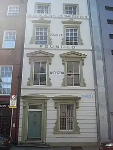 The founders of the society were, as described in the History of Dublin (1815), "a few individuals in the middle ranks of life, inhabiting a part of the town where the population was poor and crowded, had daily opportunities of knowing that many poor creatures who were unable to dig and ashamed to beg, expired of want and were often found dead in the sequestred garrets and cellars to which they had silently returned".[3] The part of town referred to was north of the river Liffey, in the parish of St. Michan's. The Society has traditionally acknowledged the following to have been the founders: Samuel Rosborough (linen draper), Christopher Connolly (grocer), Patrick Magin (grocer), Philip Shea (carpenter), Michael Stedman (stone-cutter), Peter Fleming (fruitman), Timothy Knowlan (pawnbroker), Thomas Wilmot, William Blacker, Laurence Toole (schoolmaster) and James Reilly. Members paid a subscription of at least 2 pence per week, which entitled them to recommend deserving persons to be given relief by the Society.[2]