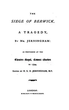 The Siege of Berwick is a four-act verse tragedy by Edward Jerningham, acted in 1793 and published the following year.[1] The text was republished in the third volume of Jerningham’s Poems and Plays (1806)[2] and then in a separate edition as The Siege of Berwick: a tragedy by Mr Jerningham as performed at the Theatre Royal, Covent Garden, edited by his great grand-nephew Hubert Jerningham in 1882.[3] The subject concerns a supposed incident during the English invasion of Scotland in 1333. Though the play is of historical interest, it was not a critical success.