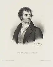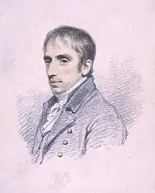 Samuel Taylor Coleridge (1772–1834) was a poet, philosopher, literary critic, and theologian who was a major force behind the Romantic movement in England. No single person had meant more to Hazlitt's development as a writer than Coleridge, who changed the course of Hazlitt's life on their meeting in 1798.[75] Afterwards at odds over politics, they became estranged, but Hazlitt continued to follow the intellectual development of one who answered more closely to his idea of a man of genius than anyone he had ever met,[76] as he continued to chastise Coleridge and other former friends for their abandonment of the radical ideals they had once shared.[77]