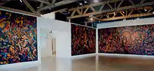 Between 1983 and 1993, a wide range of paintings from various phases of The Split of Life series were exhibited a various art centers in Argentina[30] Brazil[31]Mexico,[32] Panama,[33] Korea,[34]Kuwait,[35] Sweden,[36] Switzerland[37] and Venezuela,[38] The exhibitions were the subject of articles, essays, poems, conferences, and peace projects.[39][40][41] In Venezuela, installations were featured as part of the Second Ibero-American Symposium held in Caracas in 1987,[42] the International Encounter for Peace in Mérida in 1988.[43] The paintings displayed in different exhibitions were viewed as reflecting a sense of "over-all-ness, of one painting running into another."[44] It is remarked that the magnitude of the paintings place the viewer in the midst of a violent cage. Their synchrony and diachronic cross a still point in which the show is no longer a total of several pieces, but only one painting.[45] Some critics point to a sense of entrapment[46] in which standing in the central space surrounded by Kanso’s 12-foot-high paintings is as close as you get to being in the middle of a fire.[47] "The painted holocaust surrounding us," a reviewer wrote "entrapped us in cage of feeling".[48] "In encountering these paintings", a critic remarked, "it would be impossible to escape. The scenes draw the viewer in witnessing the violent events."[49] “We find ourselves immersed in this violent totality, terrible and incisive, we are trapped."[50] The horrors appear to burst out of the canvases bringing the viewer face to face with scenes reflecting a continuum of war and violence occurring in our time and space.[51]