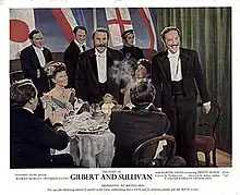 In addition to describing the ups and downs of the partnership between Gilbert and Sullivan, and their relationships with their producer, Richard D'Oyly Carte, the movie depicts many of the people who performed in the original runs of the operas and includes extensive musical excerpts from the works, staged with the assistance of Martyn Green, who advised on the performance practices of the D'Oyly Carte Opera Company.[4] The film is similar in style to other popular biopics of the era, such as The Great Caruso, and takes considerable dramatic licence with factual details and moves events in time. For example, the opening night of Iolanthe is depicted as being the opening of the Savoy Theatre, whereas the Savoy Theatre actually opened earlier, during the run of Patience.[5] The music in the film is played by the London Symphony Orchestra, conducted by Sir Malcolm Sargent.[6]