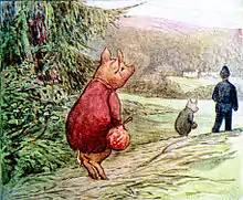 Pig-wig was inspired by a Berkshire pig which Potter had acquired from a farmer called Townley. John Cannon, the manager of Potter's farm, had objected to having a black pig on the farm so Potter kept her as a pet, describing her as "very friendly" and "likes being tickled under the chin."[1] The story was dedicated to Townley's children: "For Cecily and Charlie. A Tale of The Christmas Pig."[2]