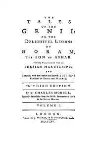The Tales of the Genii: or, the Delightful Lessons of Horam, The Son of Asmar is a collection by the English author James Ridley, consisting of Oriental pastiche fantasy tales modeled on those of the Arabian Nights. The work was originally passed off as an authentic work by a Persian imam named Horam translated into English by "Sir Charles Morell, formerly ambassador from the British Settlements in India to the Great Mogul" and published by an anonymous "editor." It is the work for which Ridley is chiefly remembered.[1]