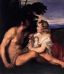 The Three Ages of Man (Italian Le tre età dell'uomo) is a painting by Titian, dated between 1512 and 1514, and now displayed at the Scottish National Gallery in Edinburgh. The 90 cm high by 151 cm wide Renaissance art work was most likely influenced by Giorgione's themes and motifs of landscapes and nude figures—Titian was known to have completed some of Giorgione's unfinished works after Giorgione died at age 33 of the plague in 1510. The painting represents the artist's conception of the life cycle. Childhood and manhood are synonymous with earthly love and death. These and the approaching old age are drawn realistically. Titian's widely chosen topic in art history, ages of man, mixed with his own allegorical interpretation make The Three Ages of Man one of Titian's most famous works.