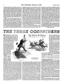 The Three Godfathers is a 1913 novel by American author Peter B. Kyne, about a trio of bank robbers who become godfathers to a newborn child. The story was originally published in The Saturday Evening Post (November 23, 1912), illustrated by N. C. Wyeth.[1]