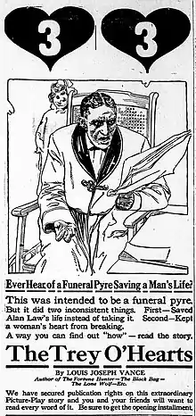 The Trey o' Hearts is a 1914 American 15-chapter action film serial directed by Wilfred Lucas and Henry MacRae. It was written by Allan Dwan and Bess Meredyth, based on a story of the same name by Louis Joseph Vance. The first chapter ran 3 reels, while the others were two-reelers. The film is currently considered to be lost. Some sources list Lon Chaney in the cast (uncredited), but this is disputed and unconfirmed.[1][2]