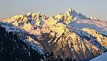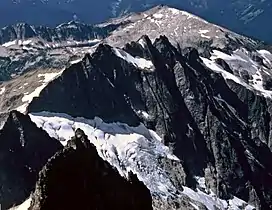 The Triad is a mountain with three peaks located in the North Cascades, in Skagit County of Washington state.[4] Situated in North Cascades National Park, The Triad is positioned west of the crest of the Cascade Range, approximately 12 miles east of the town of Marblemount. The middle peak (highest) has an elevation of 7,520+ ft (2,290+ m), the west peak 7,440+ ft (2,270+ m), and the east peak 7,520+ ft (2,290+ m).[1] The popular hiking objective, Hidden Lake Peak Lookout, lies three miles to the southwest, and the nearest higher peak, Eldorado Peak, two miles to the northeast, is a popular mountaineering objective.[1] Precipitation runoff from The Triad drains into tributaries of the Cascade River which in turn is a tributary of the Skagit River. The first ascent of the mountain was made in 1949 by Dick Eilertsen, Dick Lowery, Dick Scales, and Don Wilde. This climbing party which had three identical first names, named it the Three Dicks. However, in the interest of good taste, the more suitable and similar name was adopted since "triad" means a group or set of three connected people or things.[3]
