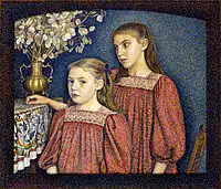 This double portrait of eight-year-old Jenny and twelve-year-old Berthe is typical of Lemmen's detailed, austere portraiture. He depicted the pair with penetrating gazes and a commanding presence, quite unlike the usual sentimentality of children's portraits. The painted wooden frame is original, one of the few surviving Neo-Impressionist frames.[2] While the red of the girls' dresses and the blue of the background are the dominant colors, Lemmen used green and orange dots across the painting and the frame to enhance those hues. Utilizing the opposite ends of the color wheel means the contrast effect stimulates greater brilliance in the red and blue than they would have evoked on their own.[3]