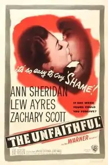 The Unfaithful is a 1947 American murder mystery film directed by Vincent Sherman and starring Ann Sheridan, Lew Ayres and Zachary Scott. It was produced and distributed by Warner Brothers. Regarded by some as a film noir, the picture is based on the W. Somerset Maugham-penned 1927 play and William Wyler-directed 1940 film The Letter,[4] which was reworked and turned into an original screenplay by writers David Goodis and James Gunn who shifted the setting from Malaya to the United States.