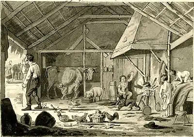 The family depicted in the poem are tenant farmers in the lowlands of Scotland. They live with their livestock in a two-roomed cottage of the but and ben design. The but was an outer room, with external access, used for cooking, storage and other household work. The ben was an interior room, warmer and more comfortable than the but, used to accommodate the family.