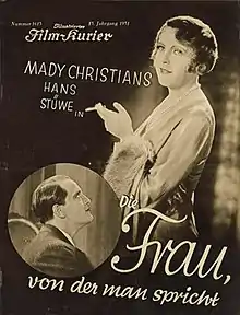 The Woman They Talk About (German: Die Frau von der man spricht) is a 1931 German drama film directed by Victor Janson and starring Mady Christians, Hans Stüwe and Lilian Ellis.[1] The film's art direction was by Botho Hoefer and Bernhard Schwidewski. It is based on the play Daniel by Louis Verneuil.