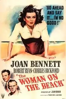 The Woman on the Beach is a 1947 film noir[2] directed by Jean Renoir and starring Joan Bennett, Robert Ryan and Charles Bickford. It was released by RKO Radio Pictures. The film is a love triangle drama about Scott, a conflicted U.S. Coast Guard officer (Ryan), and his pursuit of Peggy, a married woman (Bennett). Peggy is married to Tod, a blind former artist (Bickford).