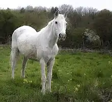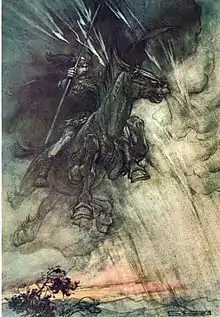 Grani is a gray horse descended from Odin's mount Sleipnir. It is captured and ridden by the hero Sigurd (or Siegfried) in the Völsunga saga (13) on the advice of an old man who is in fact the god Odin in disguise.[40] This horse then accompanies Sigurd on all his adventures. Grani possesses marvelous powers, great strength and remarkable intelligence,[41] as he proved when he broke through the ring of flames surrounding the valkyrie Brunhilde (27),[42] then mourned his master's death with his wife Gudrun. In Richard Wagner's opera Der Ring des Nibelungen, Grane is the name of Brunehilde's horse. Goti, another horse mentioned in the Sigurd legend, is the mount of Sigurd's blood brother, Gunther. Goti flees the inferno surrounding the valkyrie Brunhilde, forcing Sigurd to lend his own mount, Grani, to Gunther.[43]