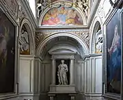Originally the chapel was called Santa Caterina «del Calice» or «del Cadice» to distinguish it from the Chapel of Santa Caterina «del Portogallo» in the right aisle. There are stucco chalices with ribbons and vases on the spandrels and the statue of Saint Catherine was holding up an antique chalice at least until the first quarter of 18th century (it was definitely missing at the time of the apostolic visitation in 1824 and later replaced by a bronze palm). The symbol of the chalice alluded to the city of Cádiz and the bishopric - although it can be noted that Girolamo Theodoli never set foot in Spain. In 1564 he was forced to resign because his long absence made his position untenable but at the same time he obtained a generous annual income of 3000 scudi.[1] This certainly helped him to acquire and decorate a chapel in the prestigious basilica of Santa Maria del Popolo a few years later.