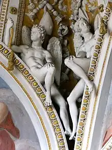 The two lateral apses with medallions of Sts. Jerome and John the Baptist celebrate the two male patron saints of Girolamo Theodoli. The painted medallions, which are decorated with ribbons and festoons, are held by pairs of white stucco angels depicted as naked young men. With their lightness and elegance these statues are the best parts of the stucco decoration.