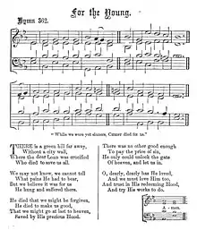 "There is a green hill far away" is a Christian hymn, originally written as a children's hymn but now usually sung for Passiontide. The words are by Cecil Frances Alexander, and the most popular tune by William Horsley.[1]