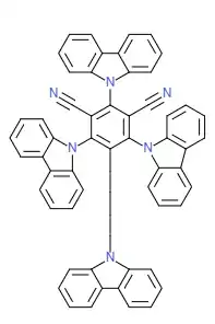 The chemical structure of many commonly used TADF materials reflects the requirement to minimize the ΔEST by displaying a twisted structure where one part of the molecule is oriented on a plane parallel to the other. One of the most commonly used and successful TADF materials 2,4,5,6-Tetra(9H-carbazol-9-yl)isophthalonitrile (4CzIPN) contains this type of structure as the bottom and top carbazole groups can be viewed as flat and coplanar while the bottom left and bottom right carbazole groups can be thought of as coming into and out of the page. Because the pairs of carbazole groups are antiplanar, the differences between the HOMO and LUMO energy levels is minimized and the compound can more easily transfer between the triplet and singlet states.