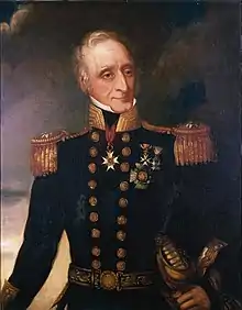 Further rewards followed after the end of the war; he was appointed a Companion of the Bath on 4 June 1815, nominated a Colonel of the Royal Marines on 12 August 1819 and promoted to Knight Commander of the Bath on 8 June 1831.[7] The Dutch nominated him a Knight of the Military Order of Wilhelm in 1816. Baker became a rear-admiral on 19 July 1821, and took up the position of commander-in-chief on the South America Station in 1829.[7] During his period of command, the second voyage of HMS Beagle took place, carrying the naturalist Charles Darwin. The Beagle came under his orders as the senior officer of the station, and he was requested by the Admiralty to supply any of the needs of the surveying mission.[22] Baker remained in command of the station until 1833. The Baker River (Chile) bears his name.[23] He returned home, was promoted to vice-admiral on 10 January 1837, and died at Walmer on 26 January 1845, at the age of 74.[7]