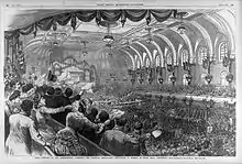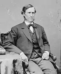 Bayard and his father continued in private law practice through the war. Both were pleased with the Democrats' peace platform in 1864, but disappointed in the choice of nominee, Major General George B. McClellan, a War Democrat.[17] In 1866, Thomas Bayard successfully represented four South Carolinians in habeas corpus cases against the military.[18] The following year, Senator George R. Riddle died and the legislature elected James Bayard to fill the remainder of the term, which ended in 1869.[18][lower-alpha 3] Bayard became more politically active, speaking at a public meeting in September 1867 against constitutional proposals for ending racial discrimination in voting rights.[20] The following year, he condemned the impeachment proceedings against President Andrew Johnson, who had succeeded to the presidency in 1865 after Lincoln's assassination and had threatened the Republican Congress's plans for Reconstruction of the Southern states.[20] Both Bayards attended the 1868 Democratic National Convention and, although they were unenthusiastic about the nominee, Horatio Seymour, supported the unsuccessful ticket that year.[21]
