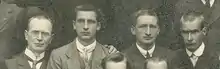 Subset from "Group portrait of released 1916 prisoners outside Mansion House, Dawson Street, Dublin", showing Eoin MacNeill, Éamon de Valera, Thomas Hunter and Piaras Béaslaí.
