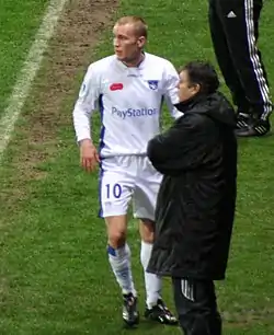 In the 2004–05 season, Kahlenberg was moved out as left midfielder, following the sale of Swedish international left winger Mattias Jonson.[37] He started the season well by setting up two goals in the first two league matches of the season.[38] However, Kahlenberg was sent–off for a second bookable offence against FK Ventspils in the second leg of the UEFA Cup second round qualification, as the club were eliminated from the tournament.[39] On 25 September 2004 Kahlenberg scored twice for the club, as they won 4–1 against Herfølge Boldklub.[40] He later scored three more goals, including a brace against AGF on 21 November 2004.[41] Cutting into the field from his wide position, Kahlenberg scored eight more goals, including a two braces against København and Herfølge Boldklub.[42] Kahlenberg managed to become Brøndby's 2004–05 league top goal scorer with 13 goals.[43] He also helped the club win the Double, both the league and Danish Cup.[44] At the end of the 2004–05 season, Kahlenberg went on to make forty appearances and scoring thirteen times in all competitions.[45]