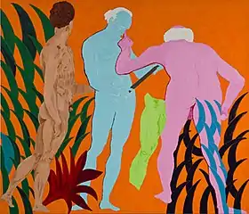 In his 1995 show, "Viennese Paintings," Lawson explored madness by juxtaposing stark, claustrophobic institutional rooms, disquieting images drawn from building facades, fountains and asylums in Vienna, and references to Freud and early modernism on diptychs rendered at topsy-turvy angles in brilliant colors.[94][11][95] His LAXART show, "History/Painting" (2007), probed geopolitical, environmental and economic instability through images of non-Western world maps and views of the globe, political leaders (e.g., Dogs of War, 2006)[96] and victims of beheadings from news and art history, painted with discordant colors and expressive techniques suggesting Max Beckmann, Emil Nolde or George Grosz.[97][88] In shows between 2009 and 2015, works such as Confrontation: Three Graces (2010) edged closer to painting's decorative potential and investigated the allegorical possibilities of the human figure, questions of desire and attraction, and the pictorial rhetoric of self-representation.[90][91][98] Artforum’s Travis Diehl described similar works, such as Theoretical Picture or Voluptuous Panic (both 2012),[99] as crossbreeding and suturing "huge chunks of culture" through jarring juxtapositions of painterly techniques, and "a weirdly savaged classicism" of truncated and silhouetted fragments from myths, statuary and contemporary media.[100][101] Reviewers described Lawson's 2015 show at Klaus von Nichtssagend Gallery as uncanny work that defied categorization and encouraged viewers "to shed their biases and re-engage with wild beauty."[93][98]